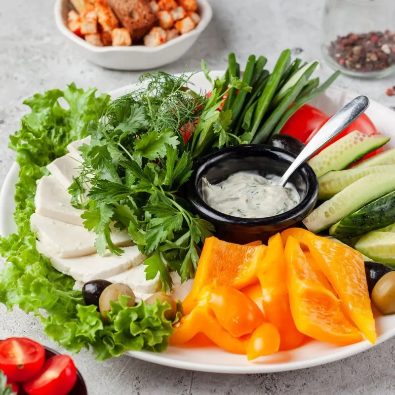 Свежие огурцы, помидоры, болгарский перец, брынза и микс трав