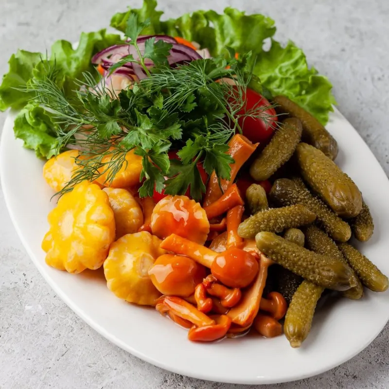 Патиссоны, корнишоны, помидоры, маринованные грибы и квашеная капуста