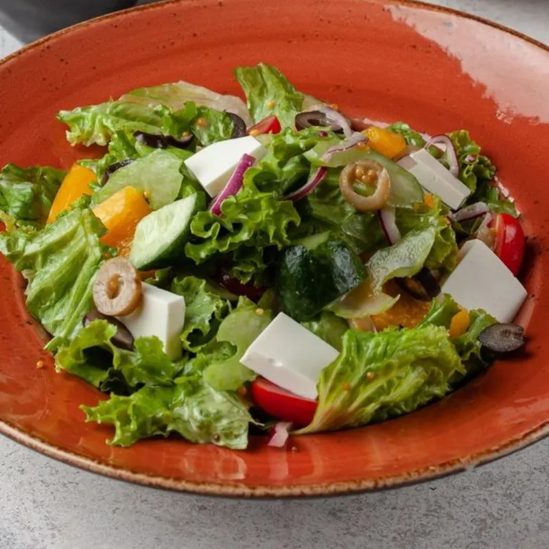 Помидоры черри, огурец в, оливки, сыр фета, греческая заправка, красный лук, сельдерей, болгарский перец.