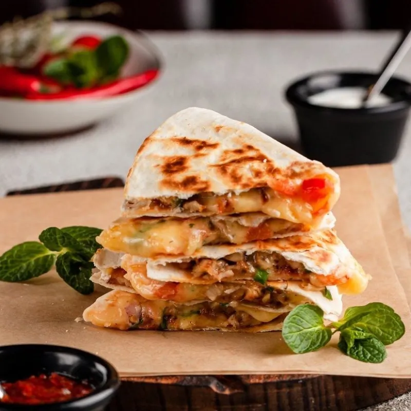 Лепешки тортилья, куриная грудка, помидоры, зеленый лук, сыр Гауда