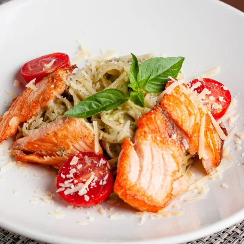Обжаренная семга, микс салата, помидоры, сухарики, пармезан