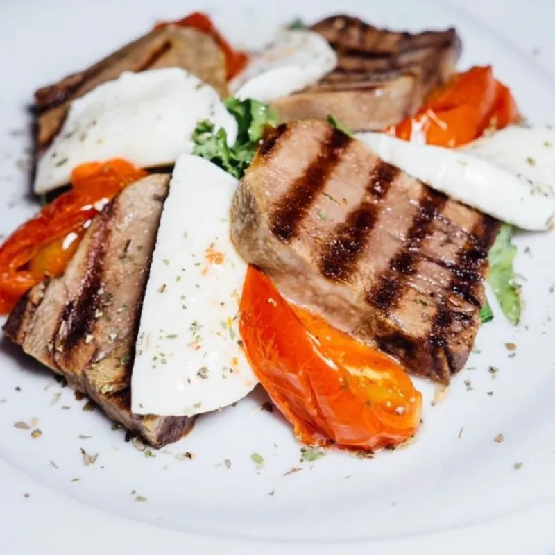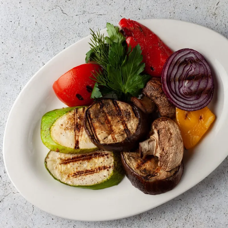 Кабачки и баклажаны обжаренные на гриле с соусом bbq, микс салата, редис, вяленые томаты, говяжья вырезка.