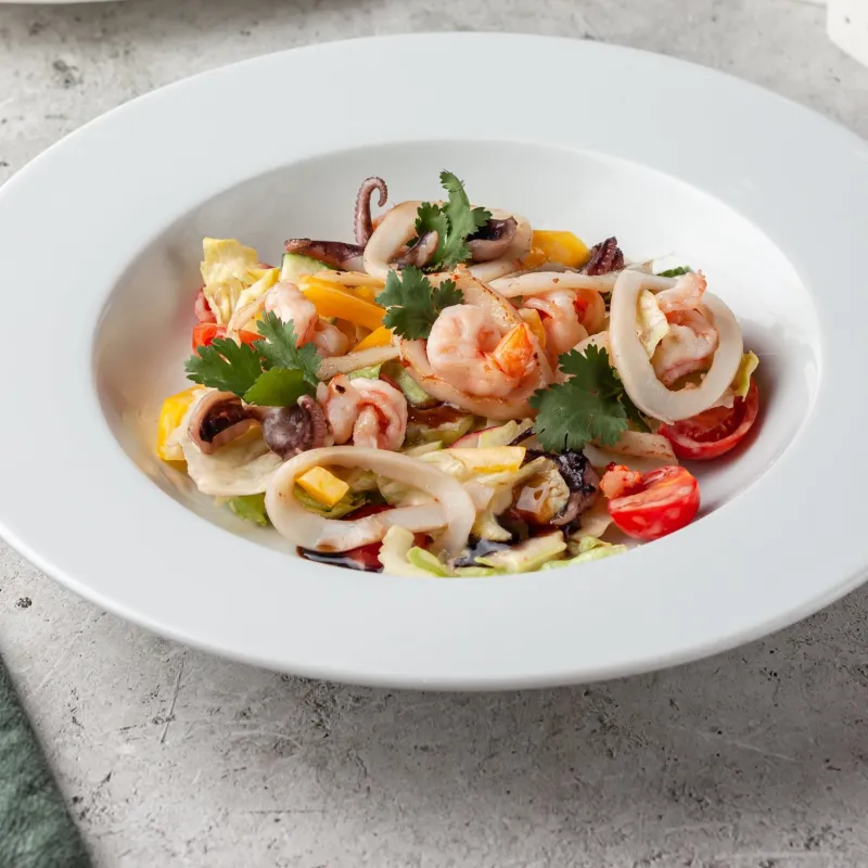 Микс салата, кальмары, осьминоги, креветки, огурцы, помидоры черри, болгарский перец, редис, сельдерей, кинза, цитрусовый соус.