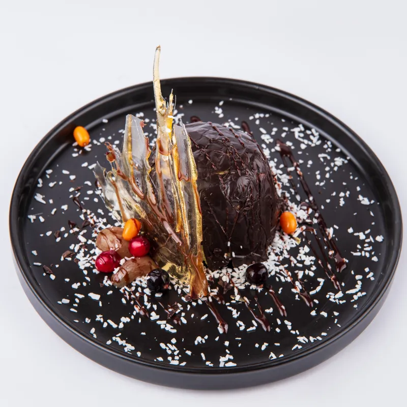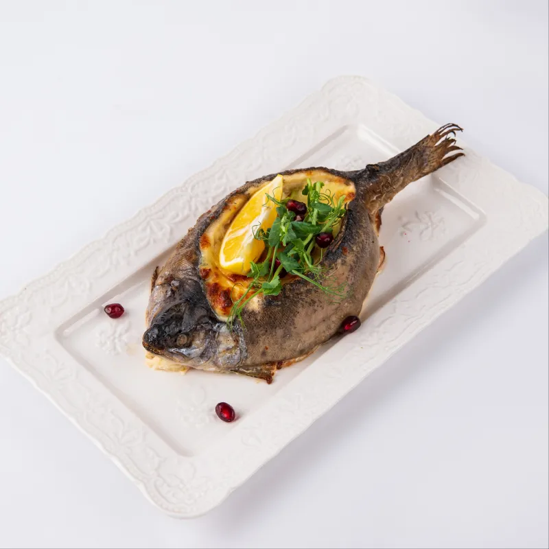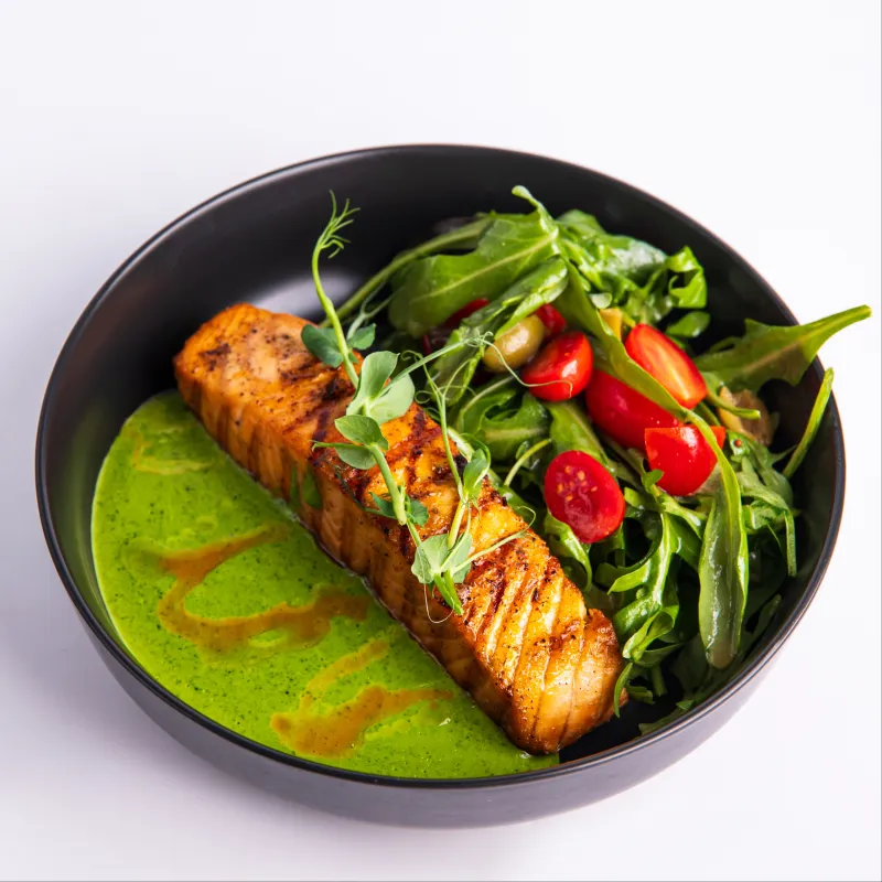 Семга на грибе со сливочным соусом, подается с оливками и черри