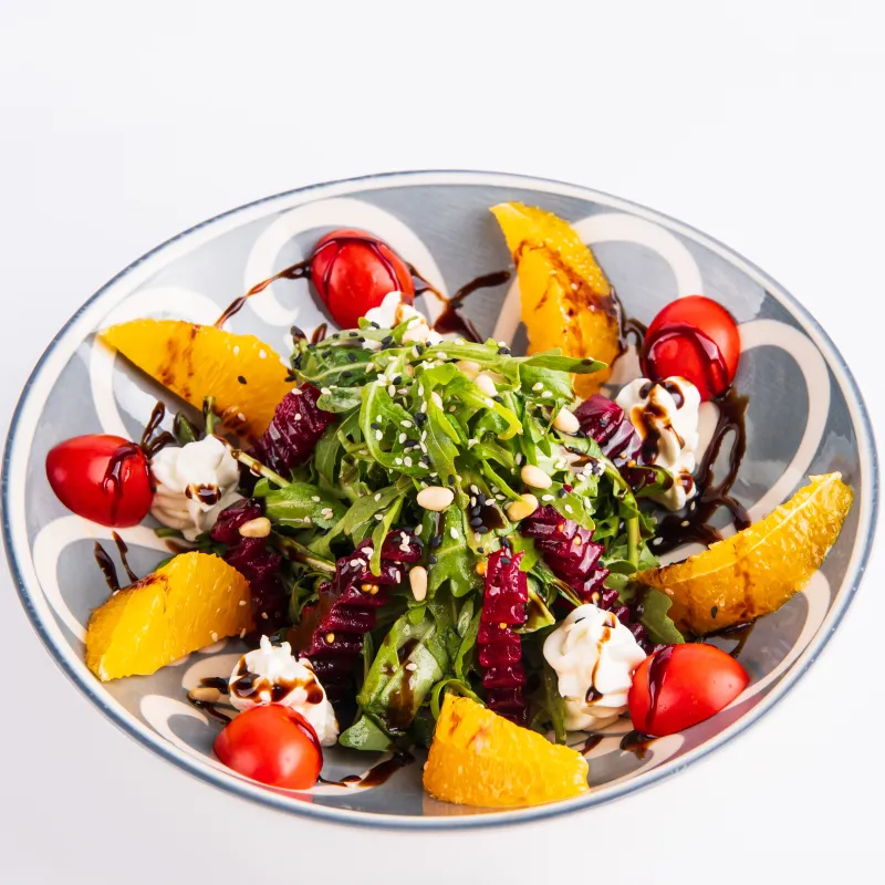 Свекольный салат с апельсинами, творожным сыром и руколой. На основе цитрусового соуса.
