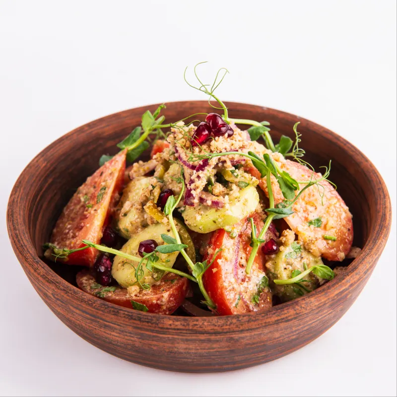 Салат из свежих томатов и огурцов, с зеленью, красным луком и грецкими орехами