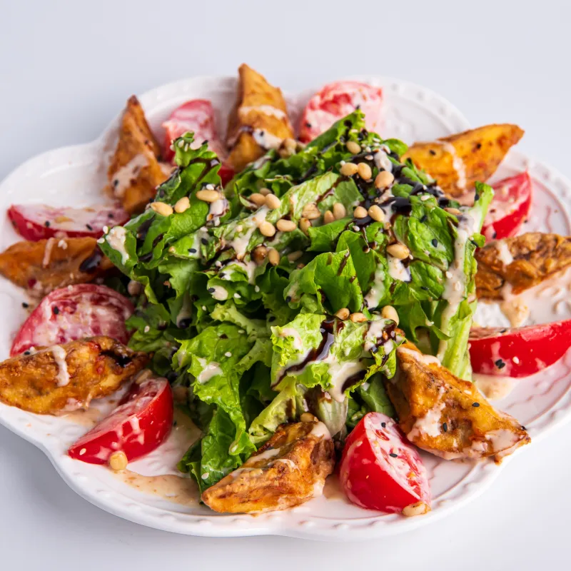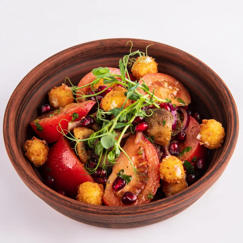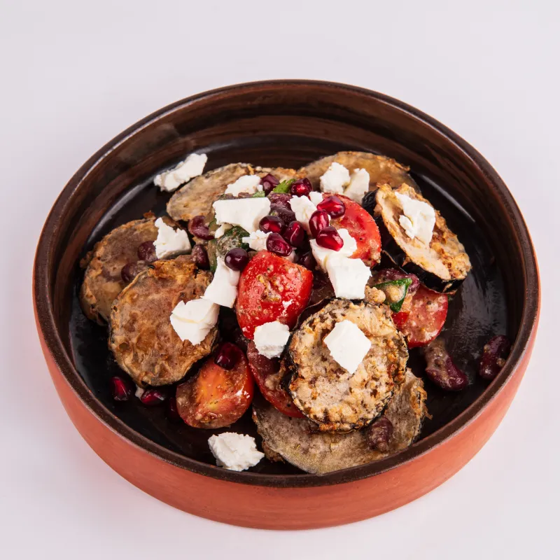 Обжаренные до золотистой корочки баклажаны, помидоры и микс листьев салата на основе орехового соуса