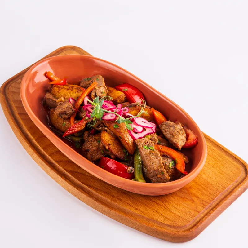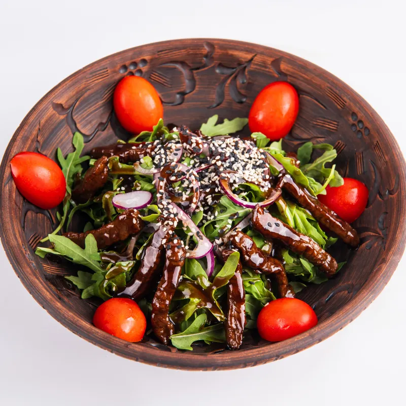 Нежные кусочки говяжьей вырезки, обжаренные с помидорами черри, луком и зеленью с ароматными Грузинскими специями