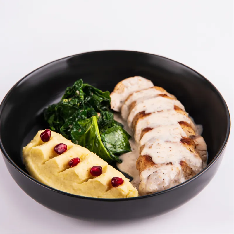 Нежная курочка в сливочном соусе и помидорами. Подается с пюре