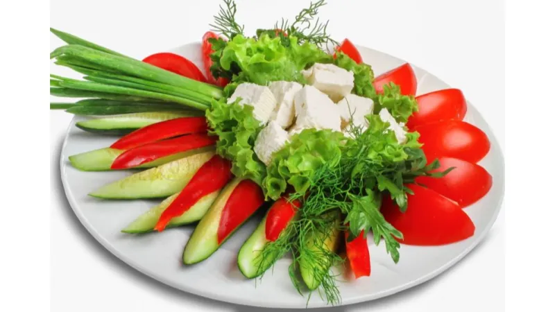 Нарезка из свежих огурцов, помидоров , болгарского перца, зелени и домашней брынзы