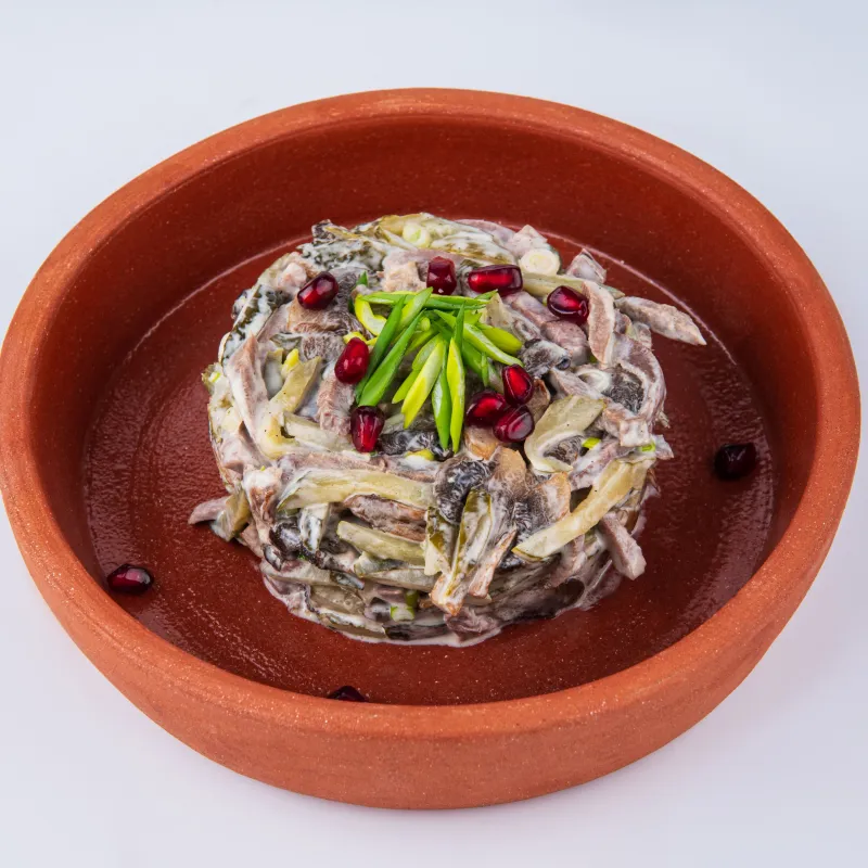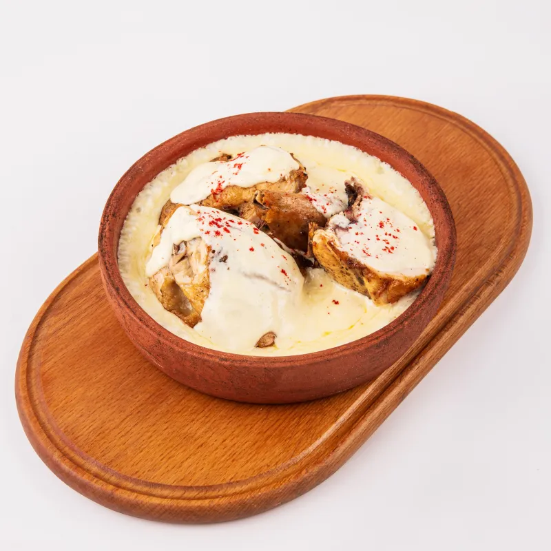Обжаренные кусочки домашней курицы, заправленные ореховым соусом по традициям Мегрелии