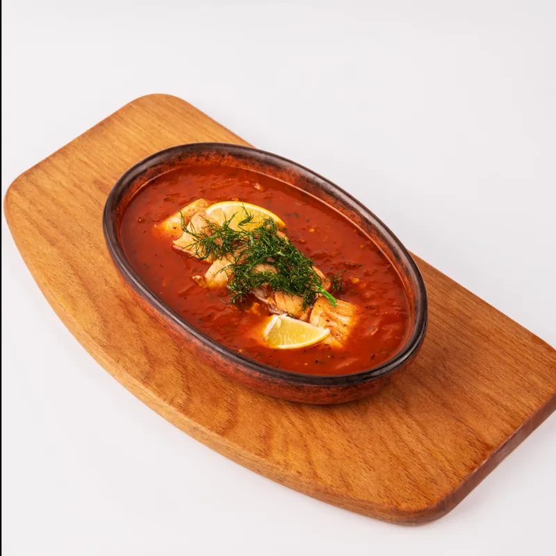 Кусочки нежной семги со свежими помидорами, луком и зеленью с грузинскими специями