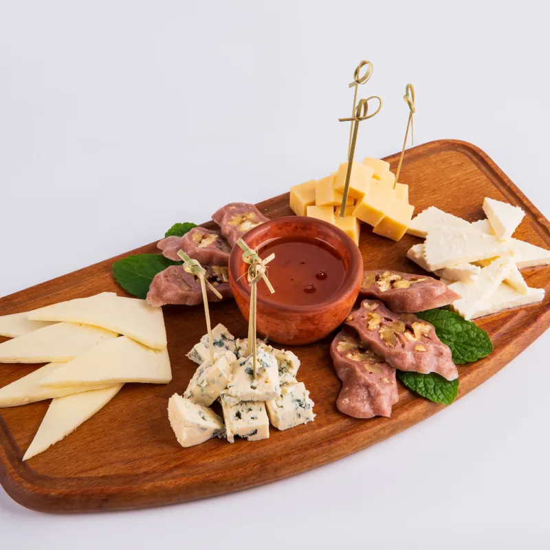 Сыр сулугуни, гауда, пармезан, и дорблю. Подается с грецкими орехами и медом