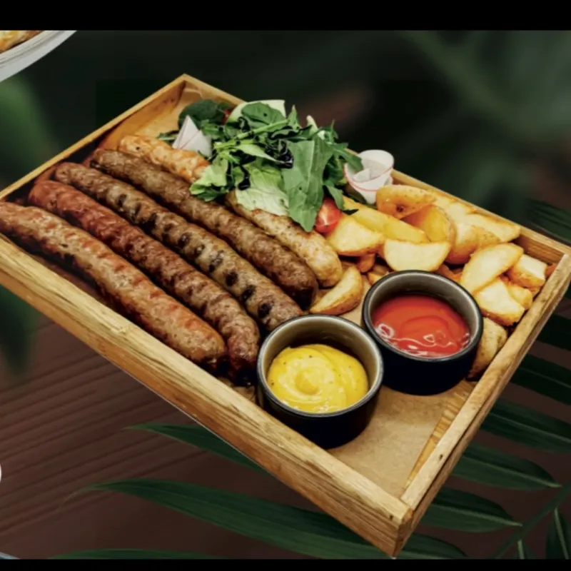 Колбаски обжареные на гриле (говядина, курица, конина, баранина и говядина чили). Подается с кортофельными дольками медовой горчицей и кетчупом.
