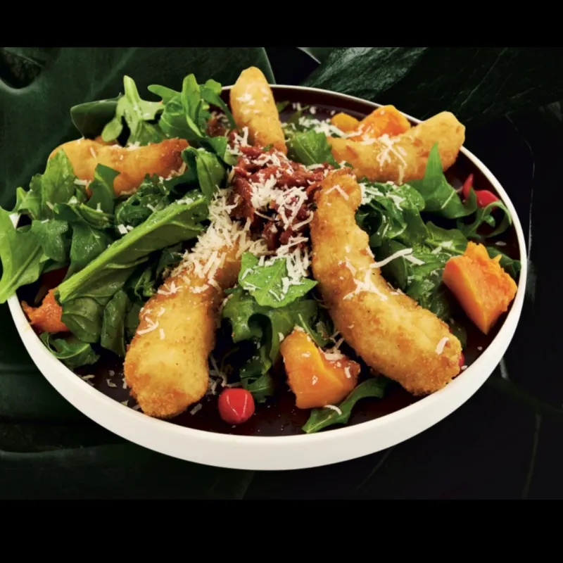 Тигровые креветки в панировке, запеченная сладкая тыква, вяленые томаты черри, свежая зелень из рукколы и шпината заправленные оливковым маслом.