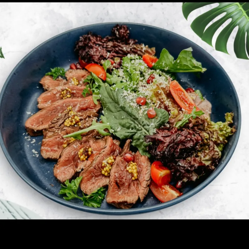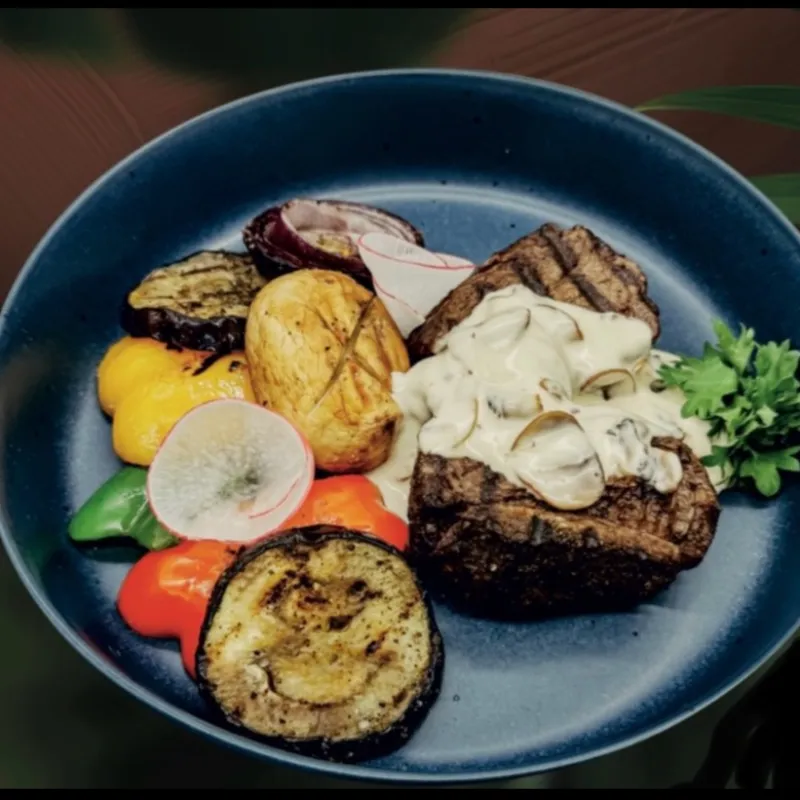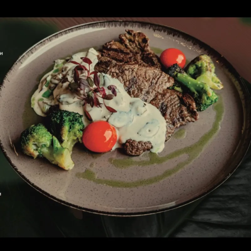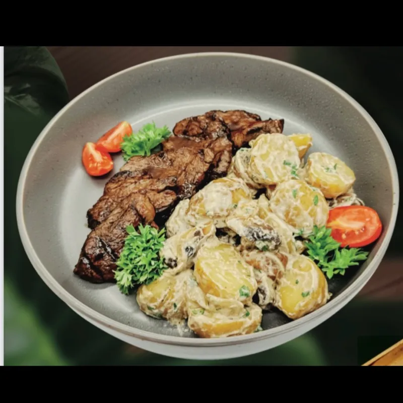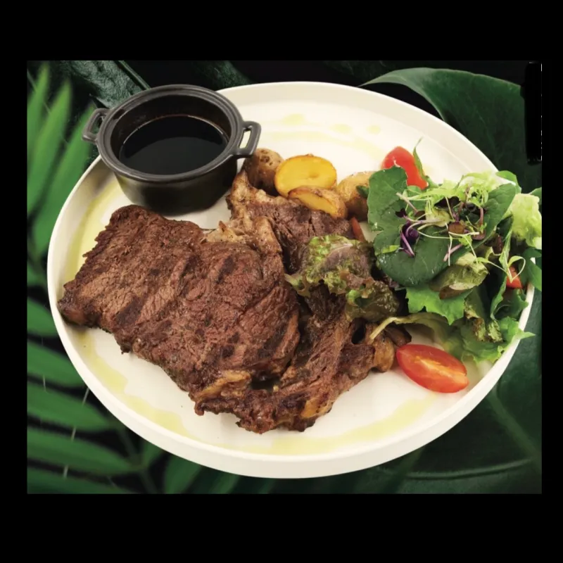 Сочный стейк обжаренный на гриле с розмарином. Подается с запеченным молодым картофелем и микс салатом.