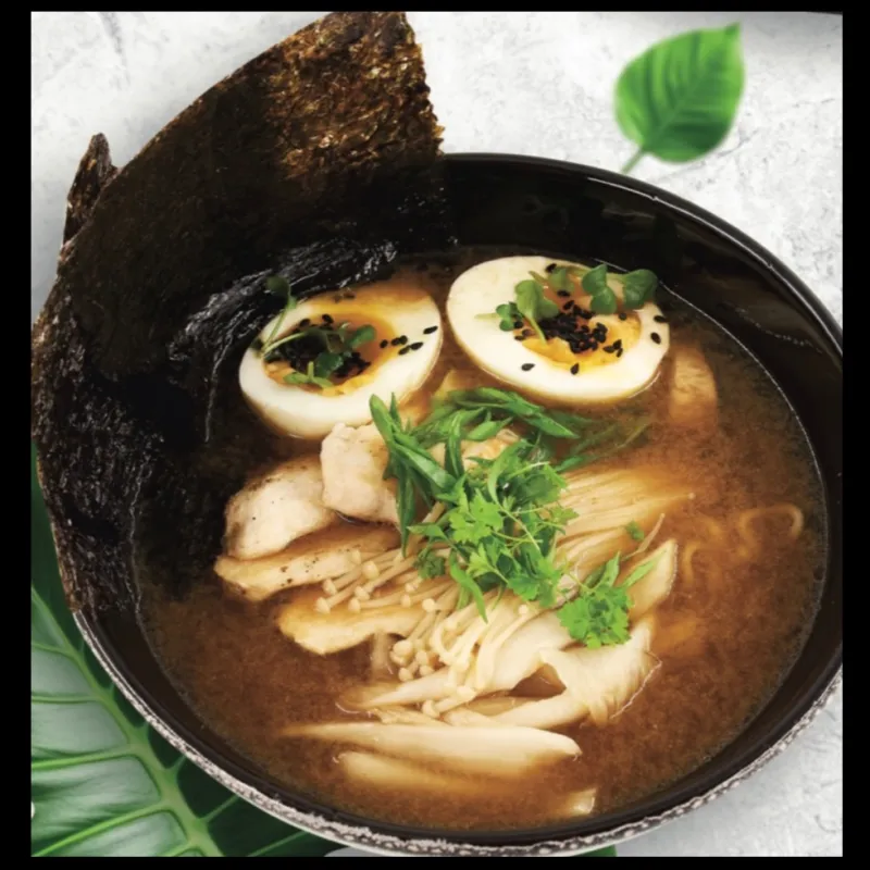 Острый суп на основе куриного бульона с грибами эноки, отварным яйцом, лапшой и кусочками куриного филе.