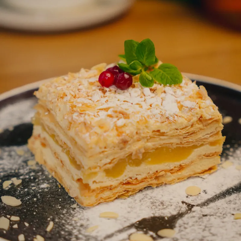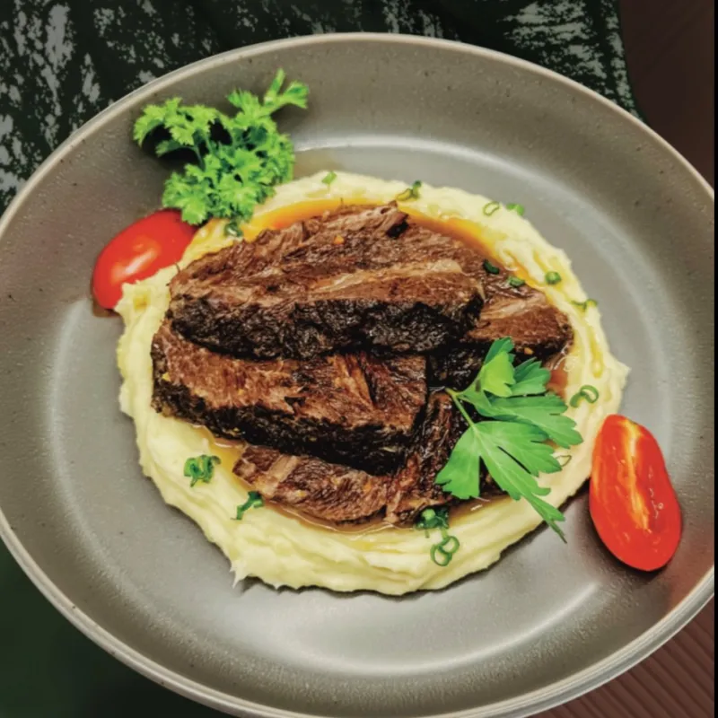 Нежные говяжьи щёчки, томленные 6 часов в специях и травах подаются с картофельным пюре и винным соусом.