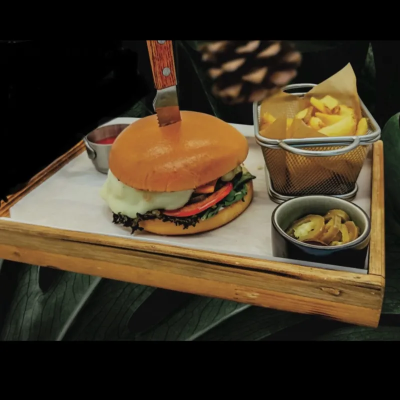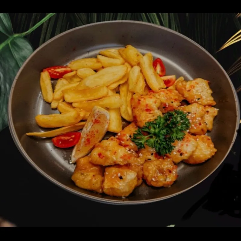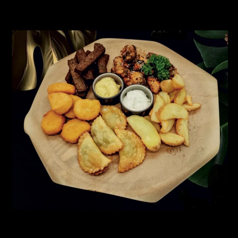 Чебуреки, картофельные дольки, крылышки BBQ, чесночные гренки, наггетсы, сырный соус и соус тар-тар.