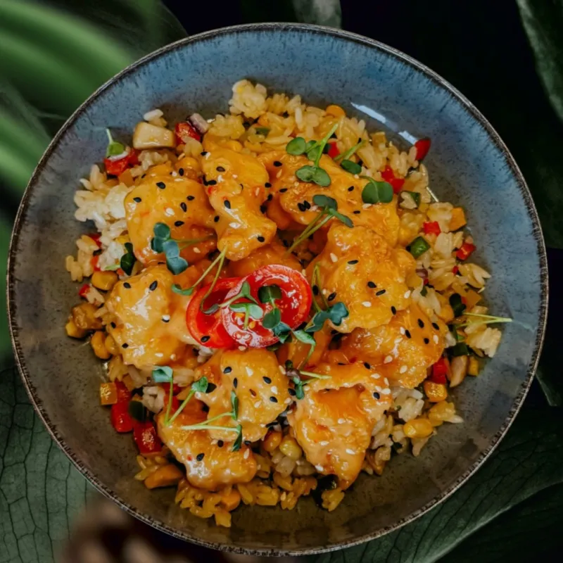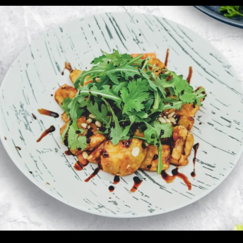 Обжаренные баклажаны до хрустящей корочки, нежные томаты конкасе, пряный перчик чили, кедровые орехи, соус сладкий чили и свежие листья кинзы.