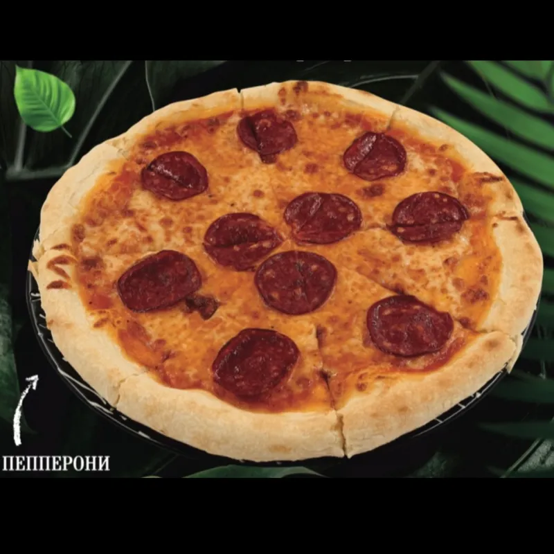 Салями, сыр моцарелла в фирменном томатном coyce.