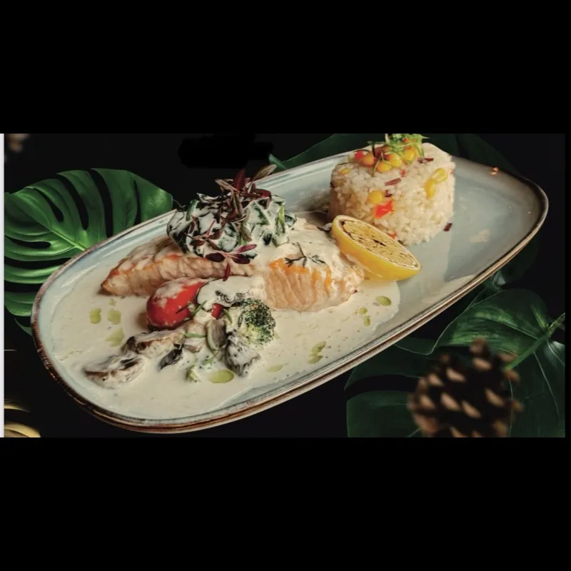 Стейк семги обжаренный на сливочном масле с тимьяном, томатами черри, брокколи и шпинатом в сливочно-чесночном соусе. Подается с рисом.