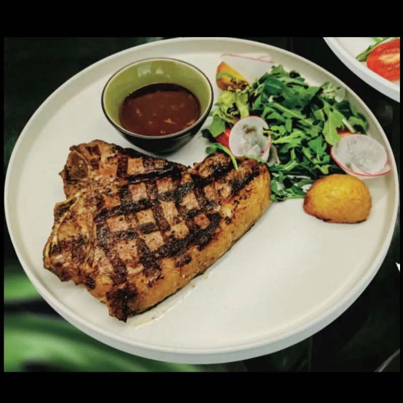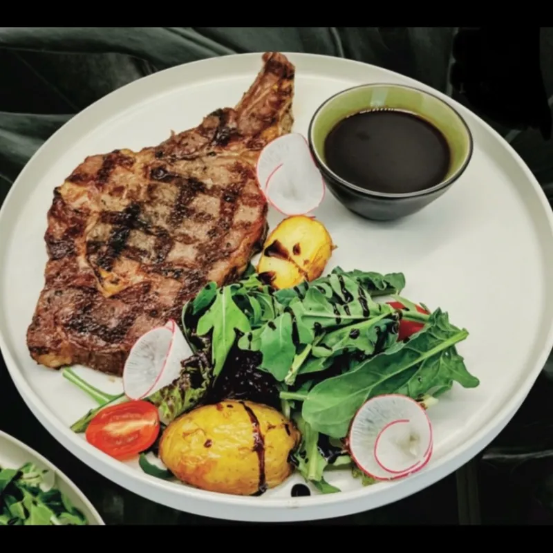 Сочный стейк на кости обжаринный на гриле с розмарином. Подается с запеченным молодым картофелем и микс салатом.
