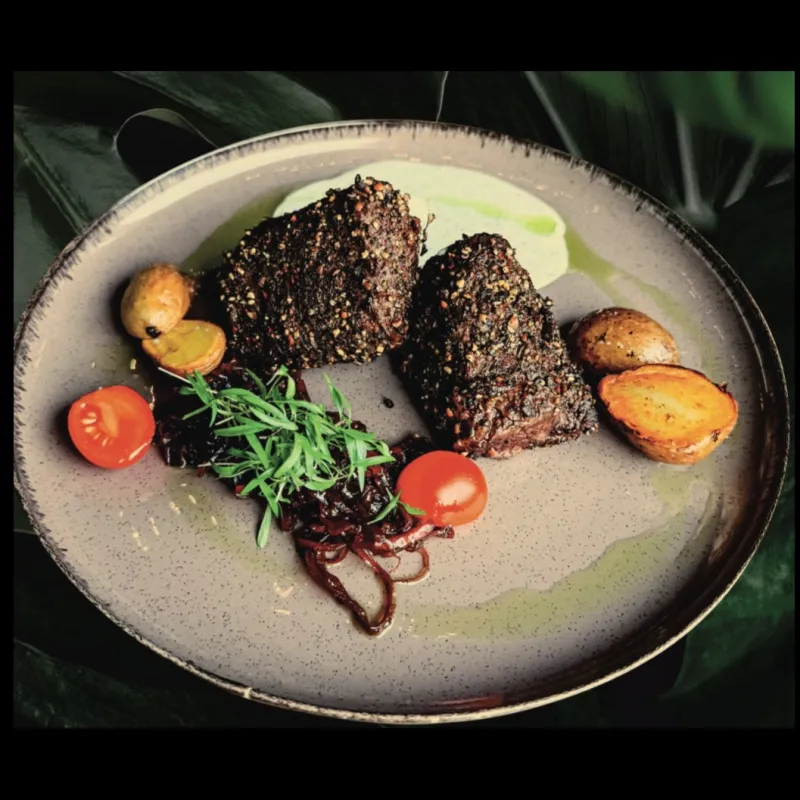 Медальоны на гриле, в смеси из 5 перцев подается с молодым картофелем, карамелеризированым луком и сливочно-перечным соусом