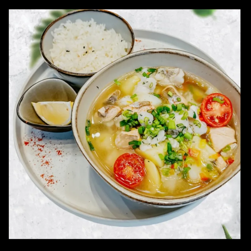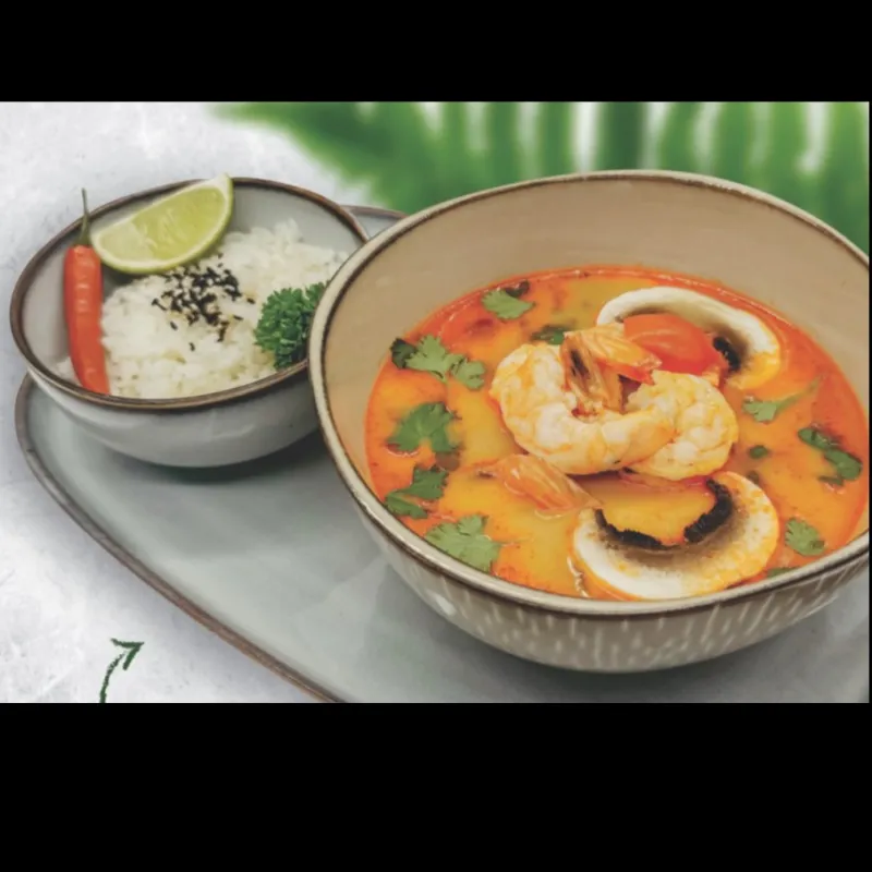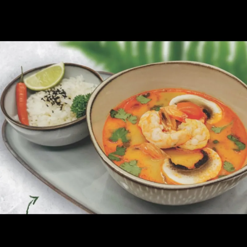 Пряный суп на основе рыбного бульона, микс из морепродуктов с кокосовым молоком. Подается с лаймом и отварным рисом