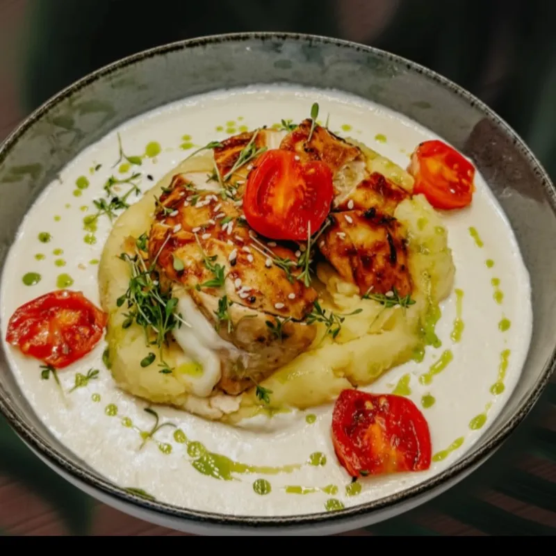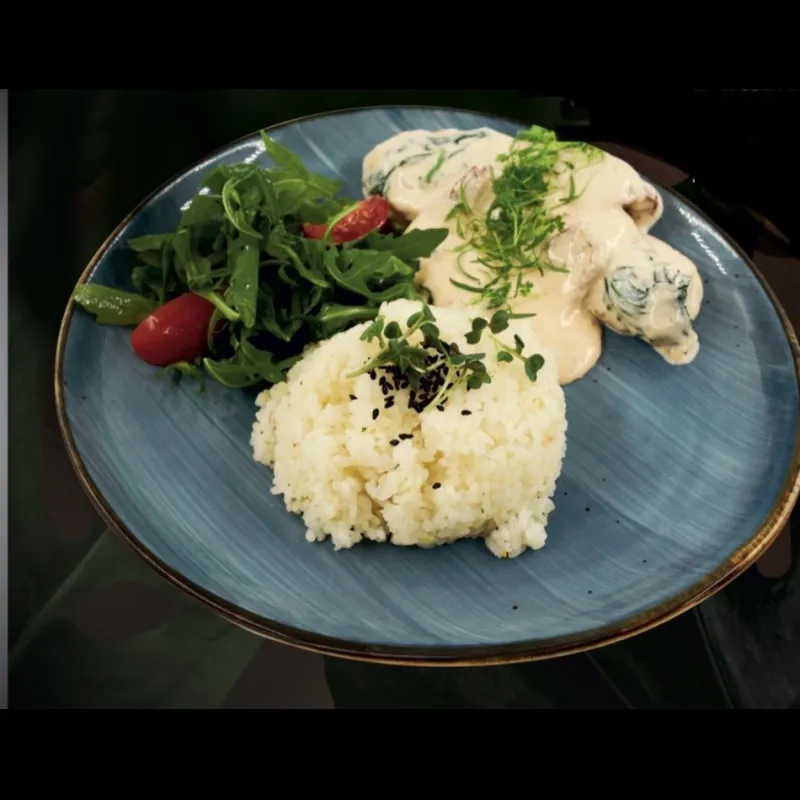 Сочное куриное филе в сливочном соусе, томатами черри и шпинатом. Подается с рисом.