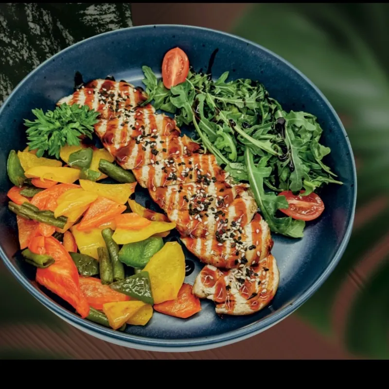 Куриное филе в соусе терияки, обжаренное со специями и овощами (болгарский перец стручковая фасоль, кабачки,тимьян