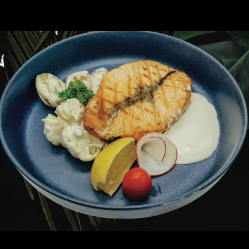 Семга обжаренная с тимьяном на гриле. Подается с картофелем, зеленным горошком в сливочном соус