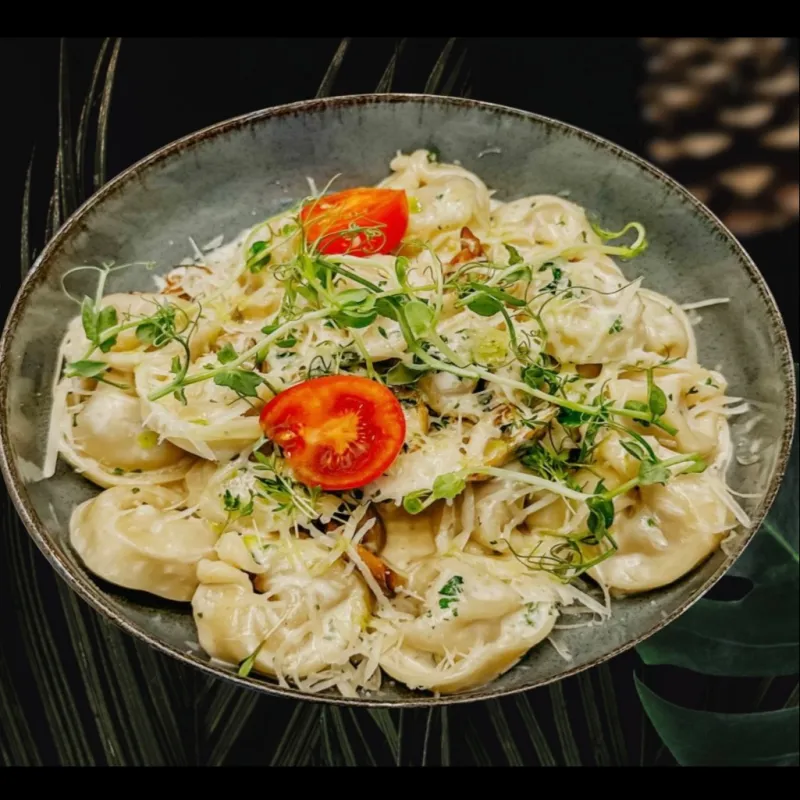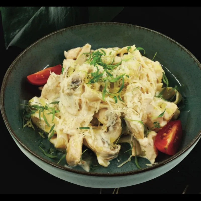 Паста фетучини с куриным филе , шампиньонами в сливочном соусе.