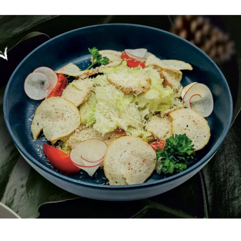 Запеченная куриная грудка, хрустящие листья салата айсберг заправленные соусом Айоли, томаты черри, пряные сухарики и сыром пармезан