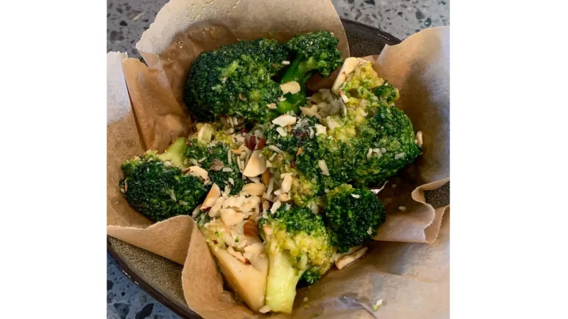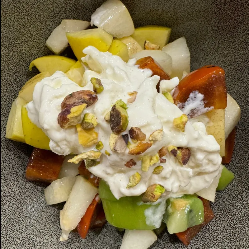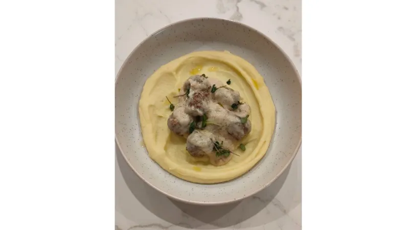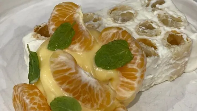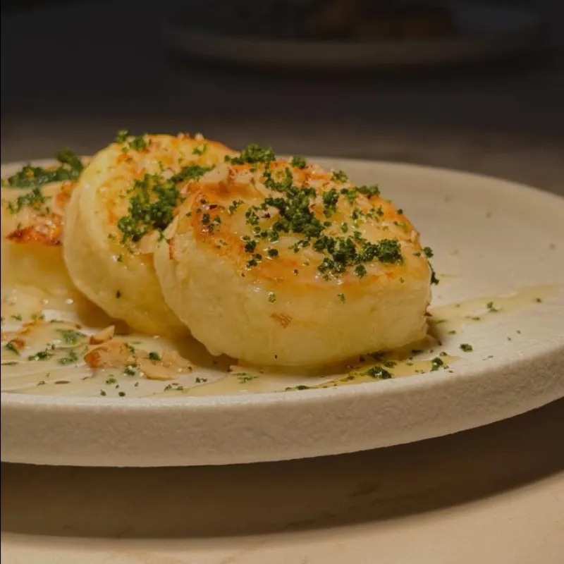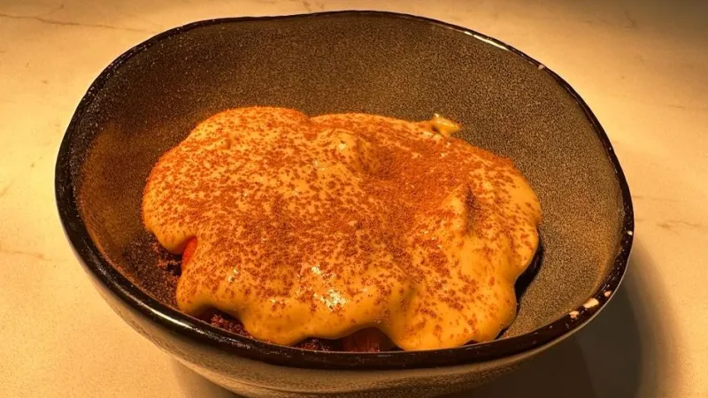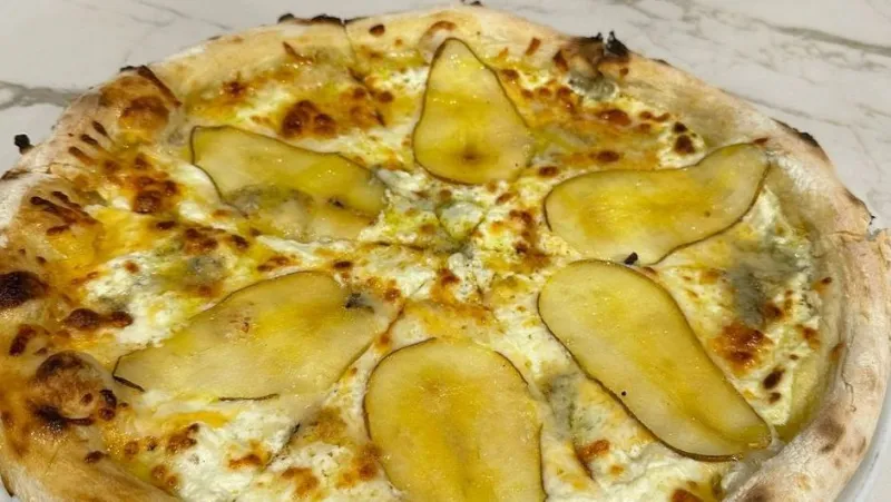 Сырники с грушей и благородным дор блю, объединенные теплым медом. Посыпка в виде грецкого ореха раскрывает глубину вкуса и текстуру сырников.