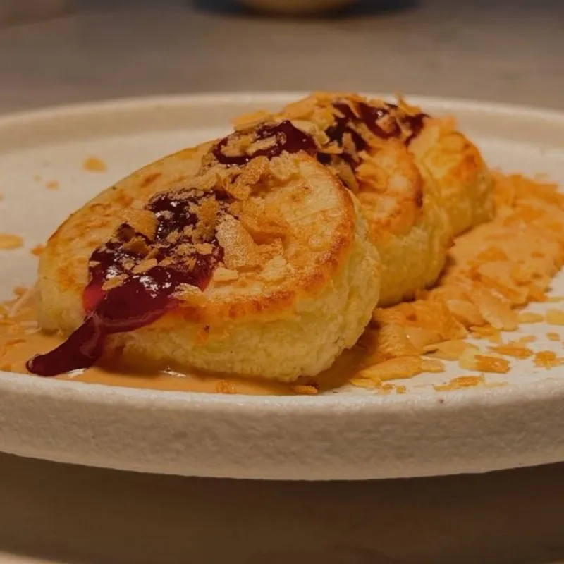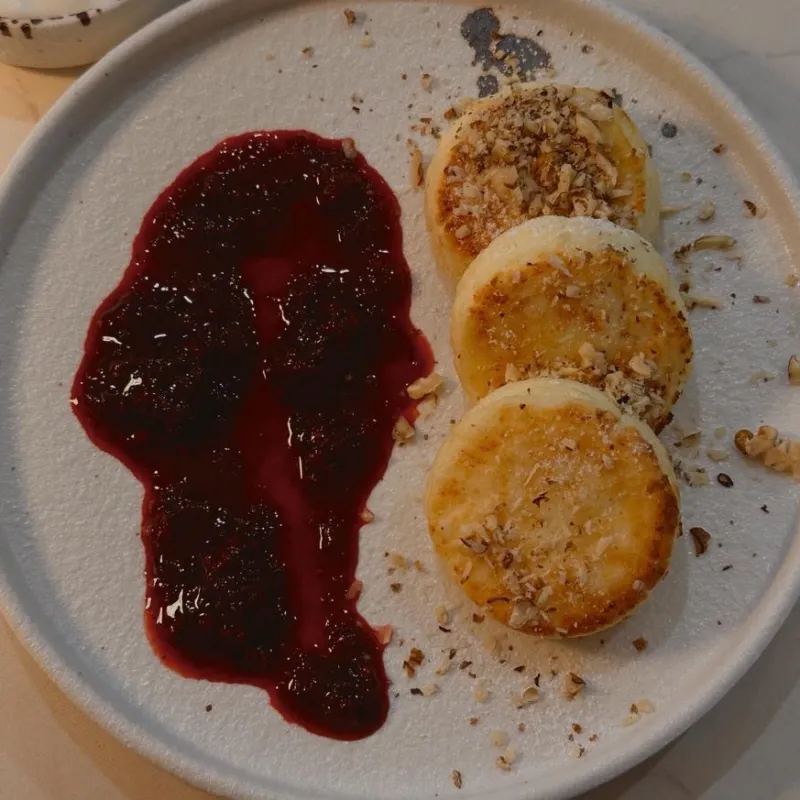 Традиционные сырники с грецким орехом и насыщенным домашним малиновым вареньем. Здесь творожная мягкость встречается с яркой ягодной кислинкой.