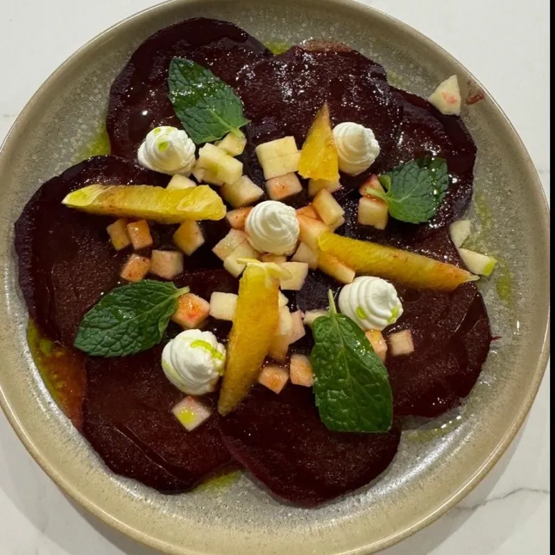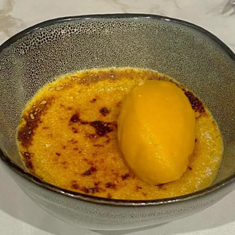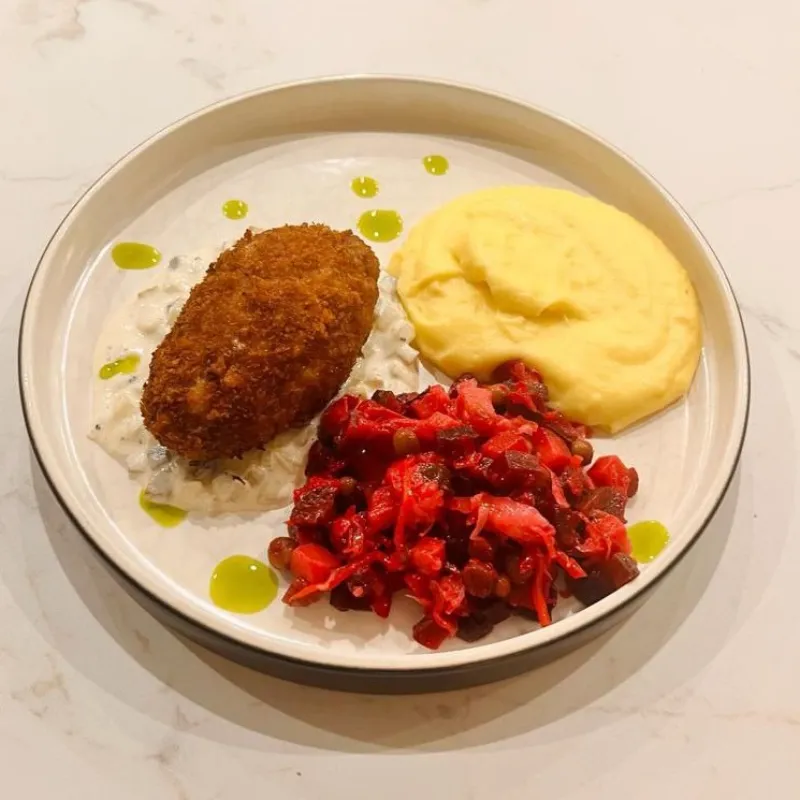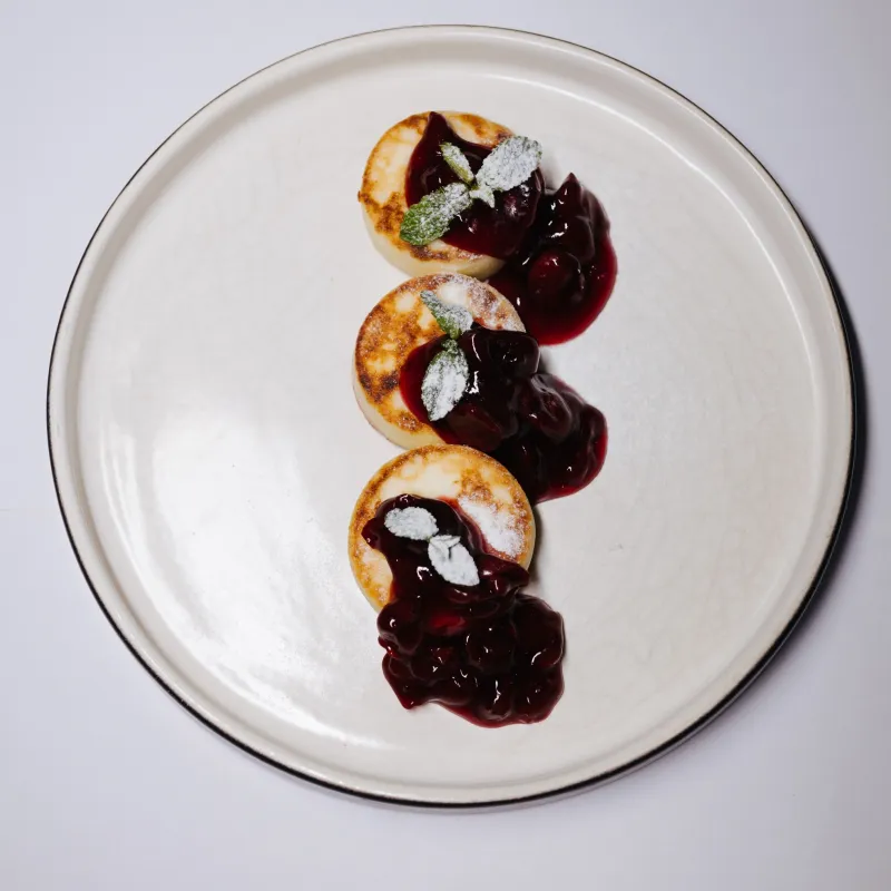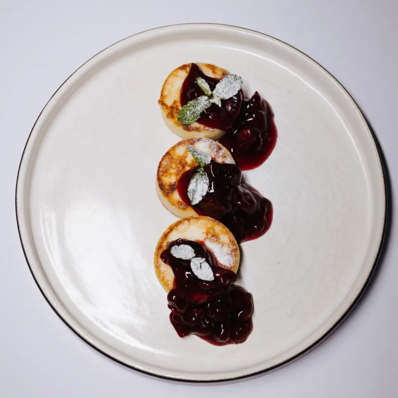 Воздушные сырники из рикотты на подложке из домашней вареной сгущенки. Клюквенный чатни добавляет выразительную кислинку,а вафельная крошка завершает образ тонким хрустом.