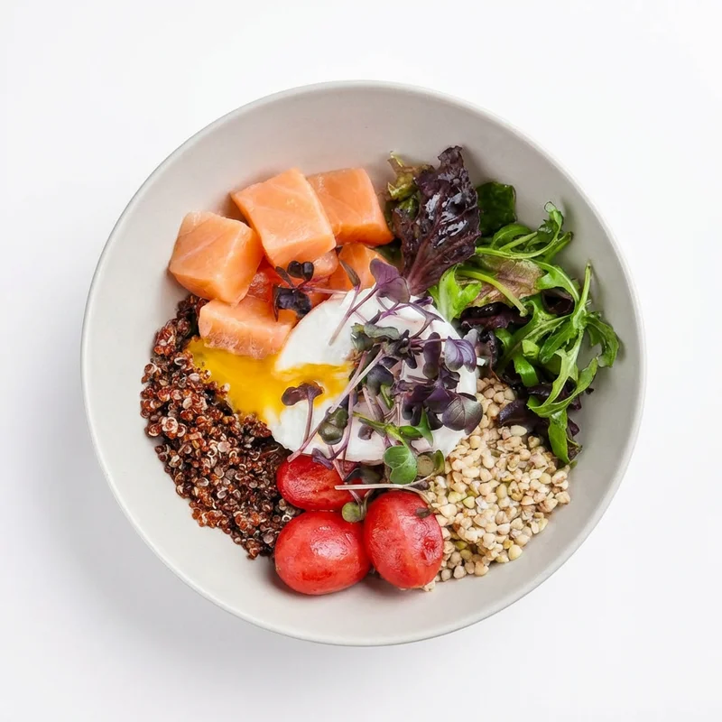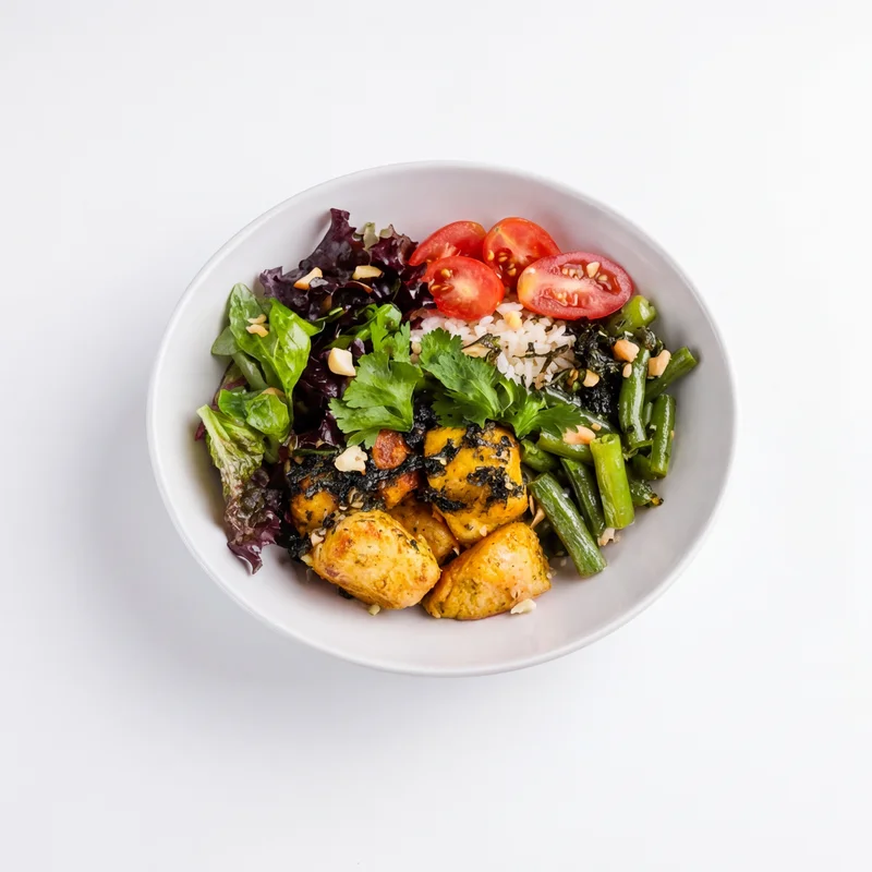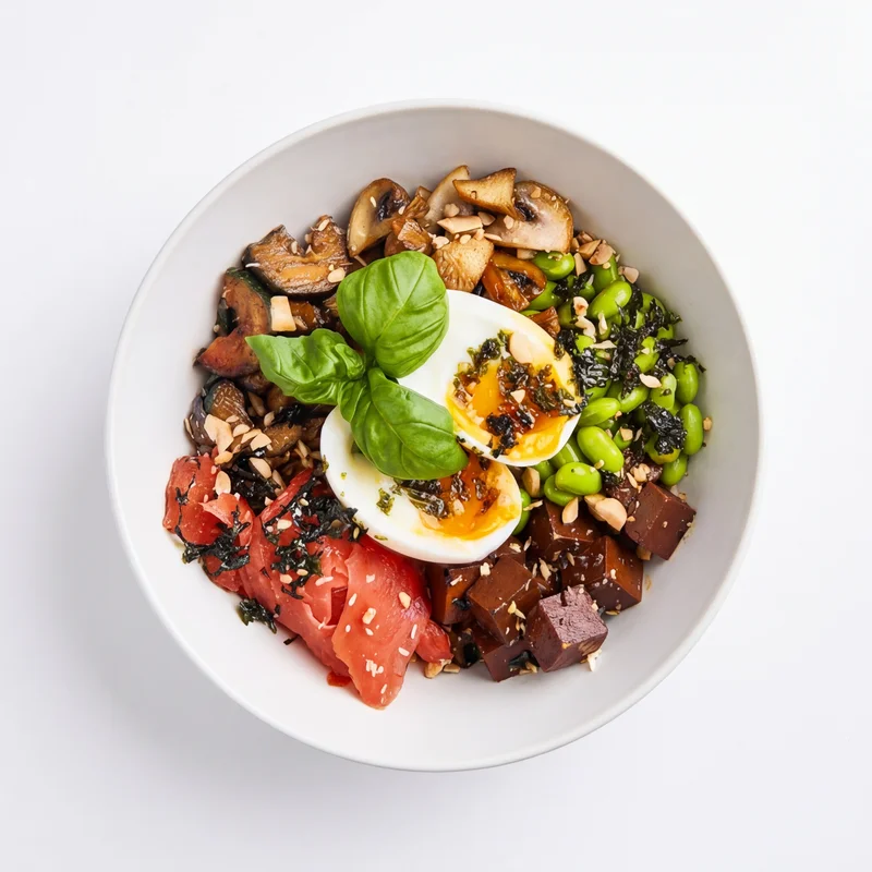Бобы эдамаме, кубики лосося, огурцы, томаты конфи, авокадо, кукуруза, маринованный имбирь, нори с соусами «Айоли» и «Понзу». Подается с зеленой гречкой и киноа