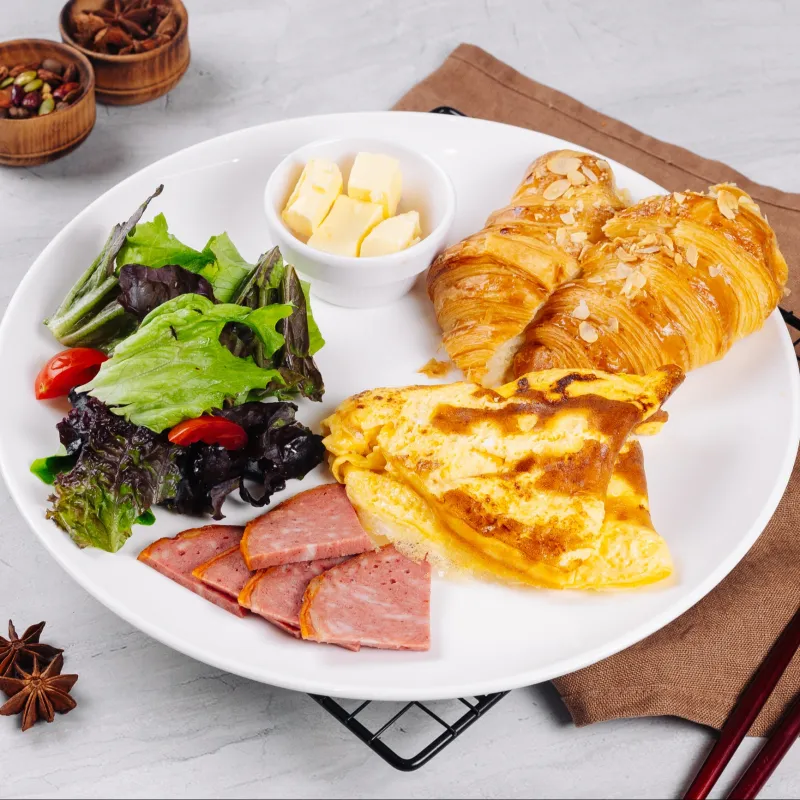 Нежный омлет, хрустящие круассаны, сливочное масло, ломтики ветчины и свежий салат микс с томатами.