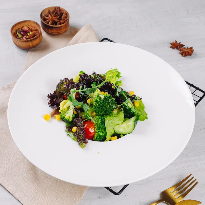 Свежие листья салата, брокколи, кукуруза, огурцы и черри в лёгкой заправке. Идеальный выбор для тех, кто любит полезную и сбалансированную еду.