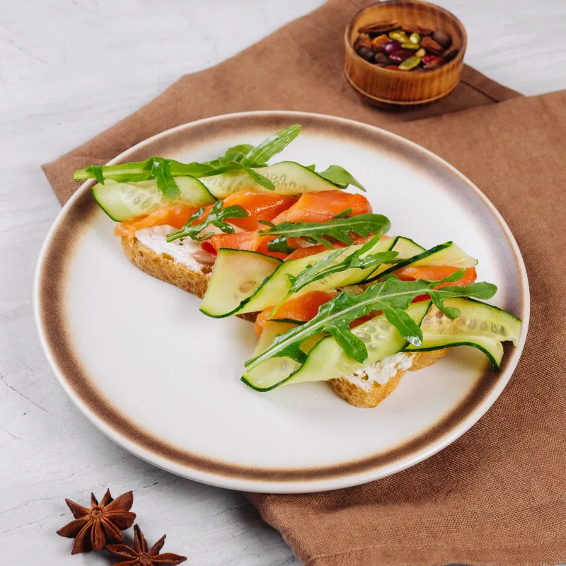 Лёгкая и свежая закуска: хрустящий хлеб с крем-сыром, слайсами слабосолёного лосося, огурцом и листиками рукколы. Идеально для лёгкого перекуса или утреннего старта