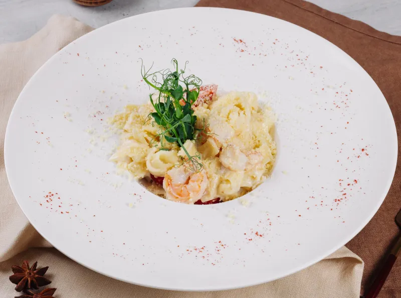 Тальятелле с сочными креветками, томатами черри и сливочным соусом, украшенные микрозеленью и сыром. Нежное и ароматное блюдо с морским акцентом.
