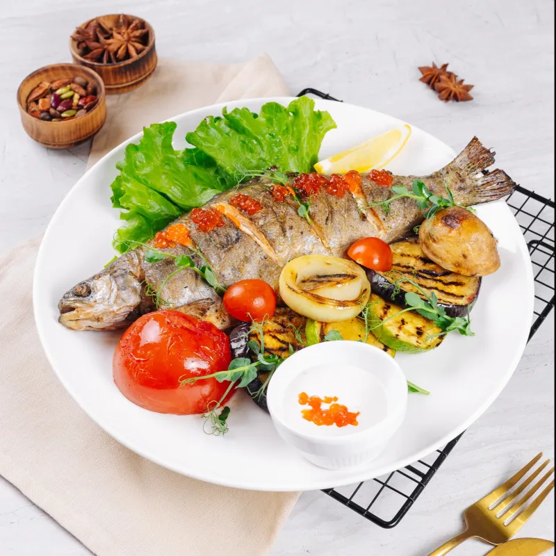 Сочная целая форель, обжаренная на гриле, подаётся с овощами-гриль (баклажан, кабачок, лук, помидор), красной икрой и соусом на выбор. Подача дополнена лимоном и зеленью.