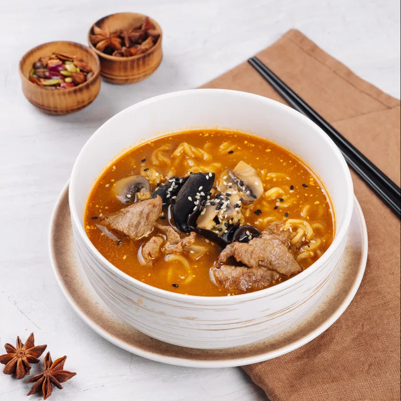 Ароматный рамен в насыщенном бульоне с ломтиками говядины, грибами и кунжутом. Острый, наваристый и сытный — идеальное азиатское блюдо для любителей пряной кухни.