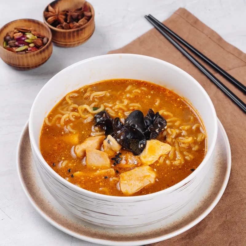 Острый рамен на насыщенном бульоне с кусочками куриного филе, древесными грибами и лапшой. Восточный вкус, который отлично согревает и насыщает.