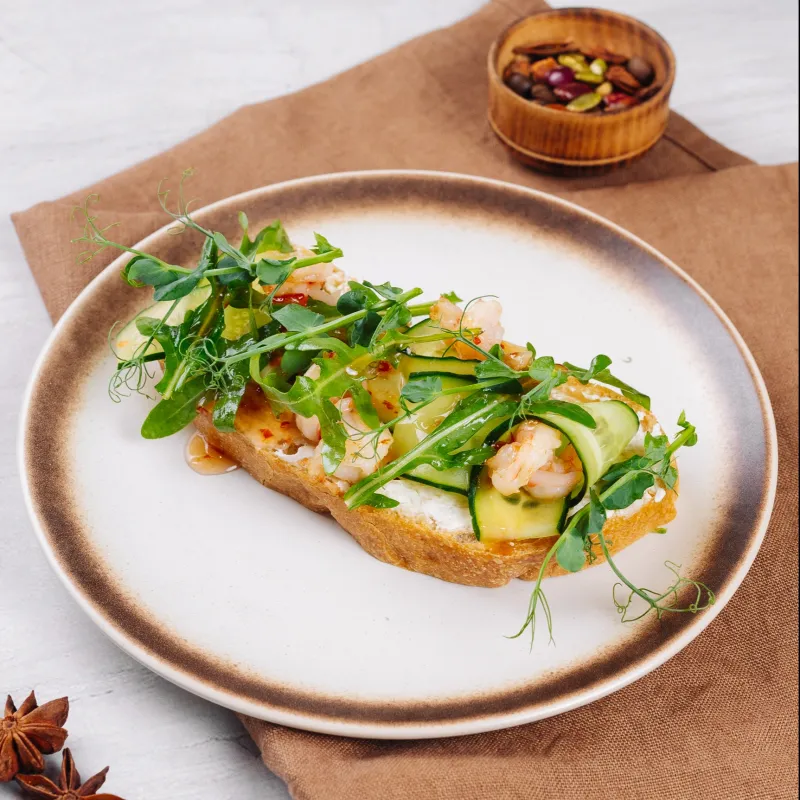 Хрустящий ломтик багета с нежным сыром, сочными креветками, свежими огурцами, рукколой и лёгкой пикантной заправкой. Лёгкое и изысканное блюдо для гурманов!