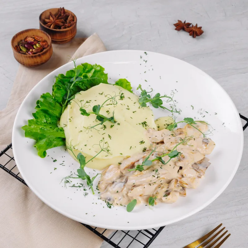Нежные полоски филе курицы в сливочно-грибном соусе, подаются с воздушным картофельным пюре. Классика, которая всегда в моде.