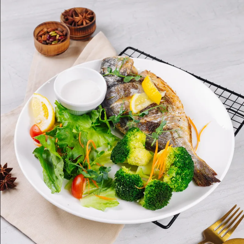 Целая дорада, обжаренная на гриле, подаётся с брокколи, микс-салатом и лимоном. Идеально сочетается со сливочным соусом.