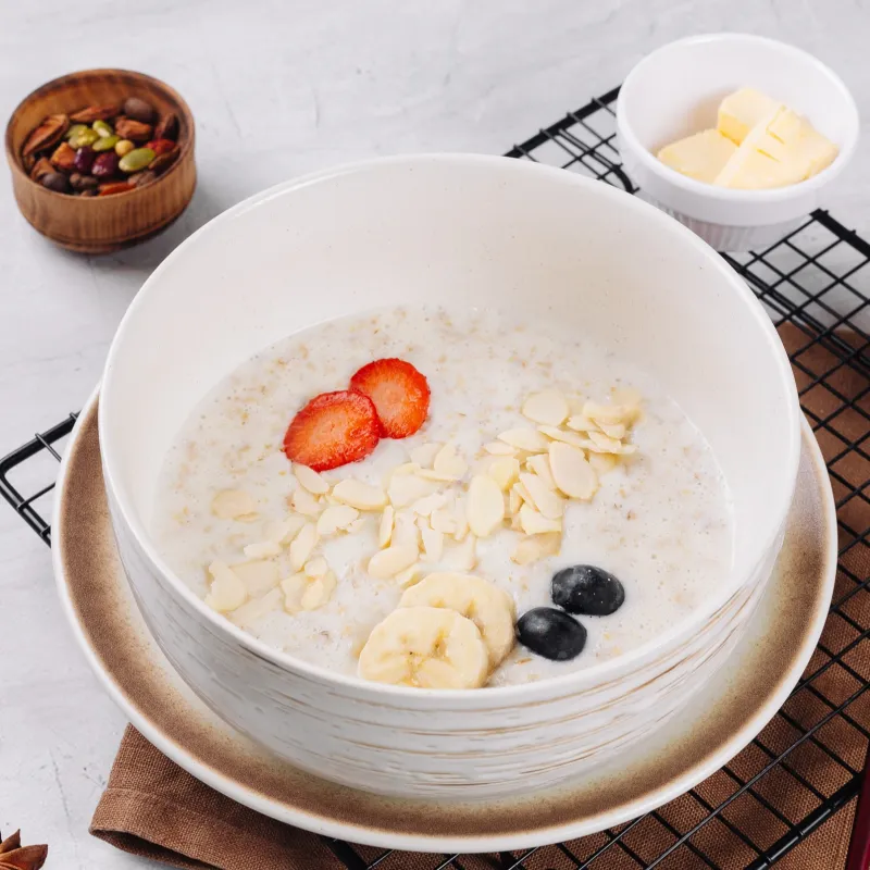 Полезная овсяная каша на молоке с добавлением свежих ягод, банана, клубники и миндальных лепестков. Лёгкий и питательный завтрак для хорошего начала дня!
