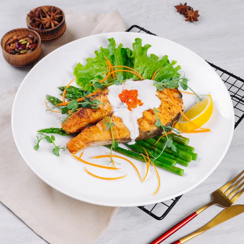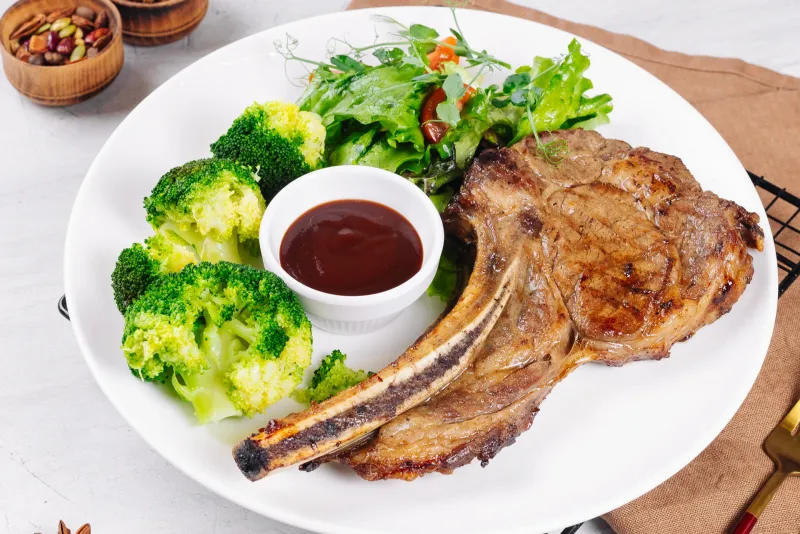 Нежный стейк Рибай на кости, обжаренное до сочной корочки, подаётся с отварной брокколи, свежим салатом и соусом BBQ. Богатое белками и вкусом блюдо для настоящих гурманов.